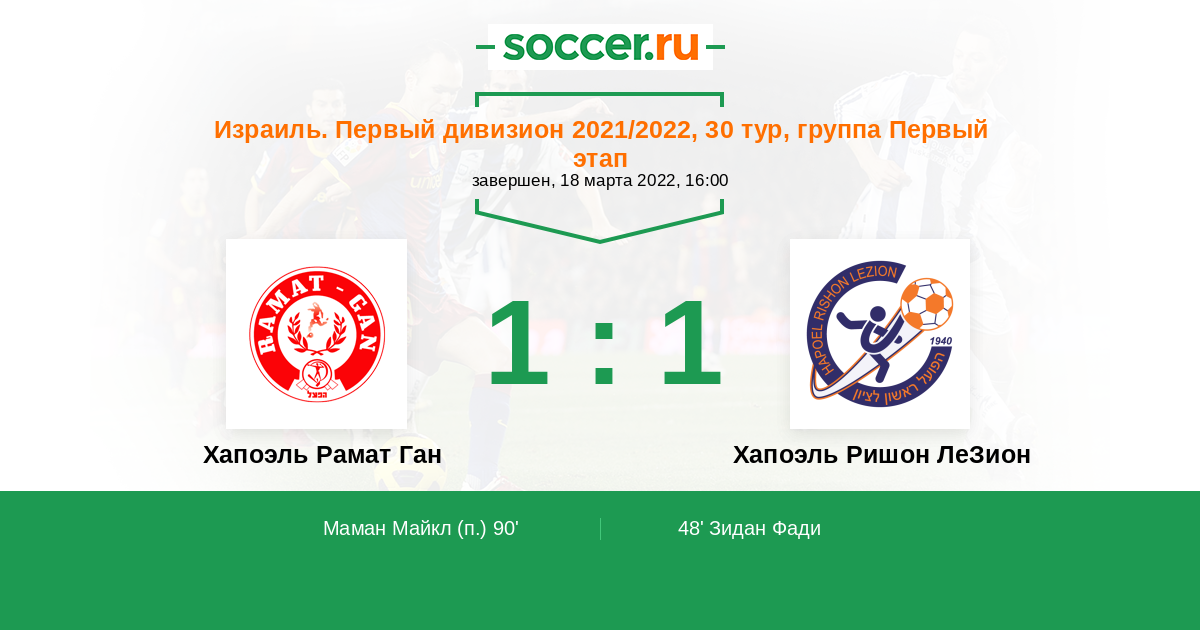 90' Гол с пенальтиЛоготип Хапоэль Рамат ГанМаман Майкл - 1:1 (П)