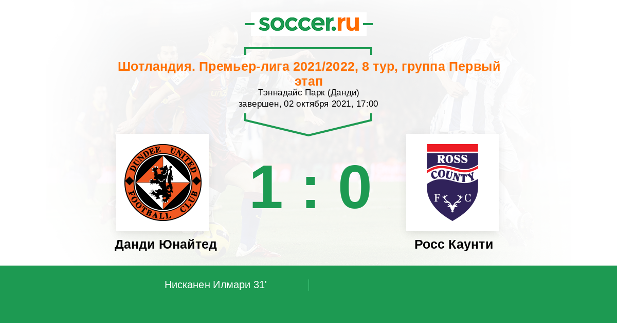 31' ГолЛоготип Данди ЮнайтедНисканен Илмари (7, п) (Логотип Данди ЮнайтедХаркес Ян (23, п)) - 1:0
