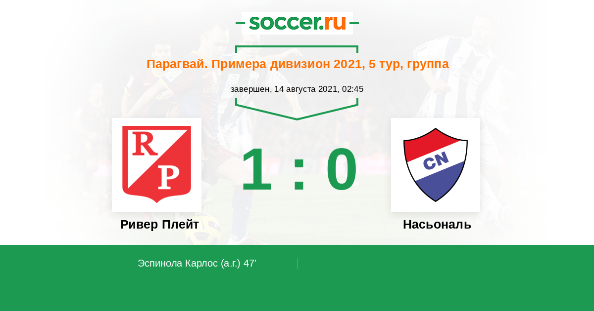 47' АвтоголЛоготип НасьональЭспинола Карлос (23) - 1:0 (А)