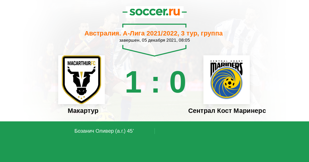 45' АвтоголЛоготип Сентрал Кост МаринерсБозанич Оливер (8, п) - 1:0 (А)