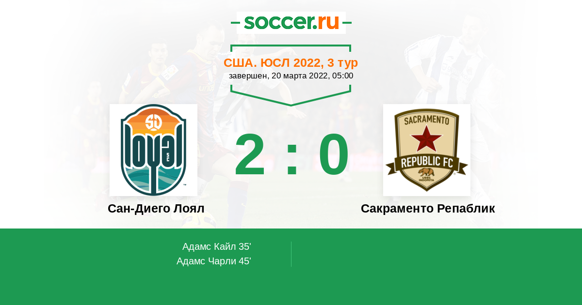 45' ГолЛоготип Сан-Диего ЛоялАдамс Чарли (6) - 2:0