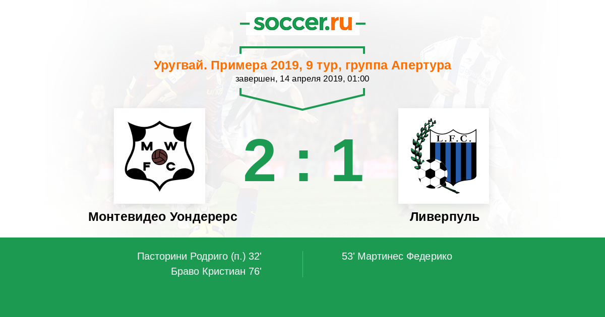 32' Гол с пенальтиЛоготип Монтевидео УондерерсПасторини Родриго (14) - 1:0 (П)
