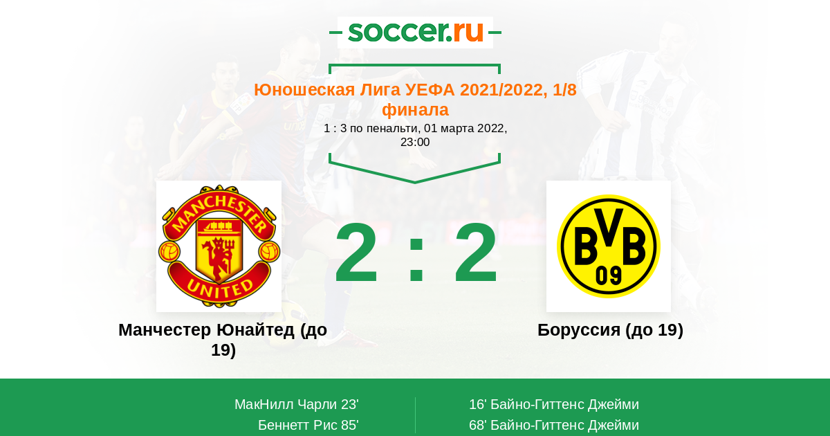 85' ГолЛоготип Манчестер Юнайтед (до 19)Беннетт Рис (66) - 2:2