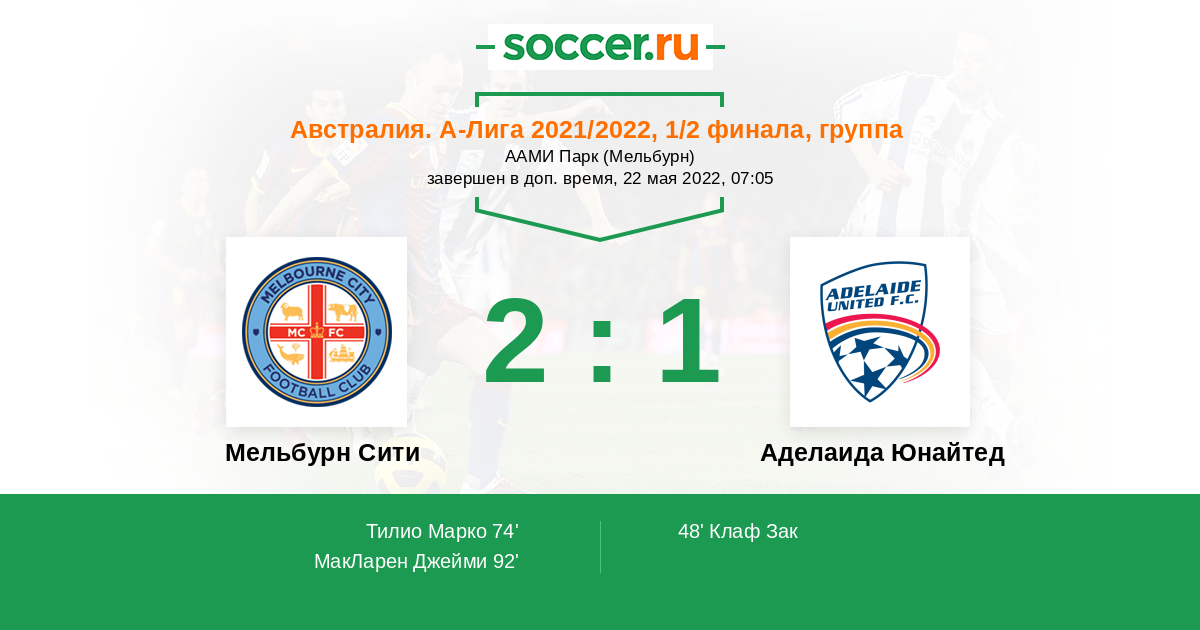 92' ГолЛоготип Мельбурн СитиМакЛарен Джейми (9, н) - 2:1