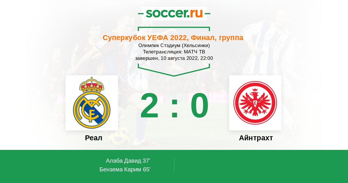 Многие сейчас посмотрят на пару прошлых матчей команд, вылет в одну калитку Антрахта от Баварии и скажут, что тут будет куча голов) Я в этом очень сильно сомневаюсь. Реал всю Лигу Чемпионов играл очень аккуратно и ловил свои моменты благодаря мастерству и голевому чутью Бензема и компании. Они сыграли несколько товарняков и только вкатываются в сезон, так что вряд ли от них мы увидим голевую феерию. Должен получится довольно результативный матч. Реал в минувшем сезоне был абсолютно противоречивым, никто не ожидал победы в Ла Лиге, ЛЧ.