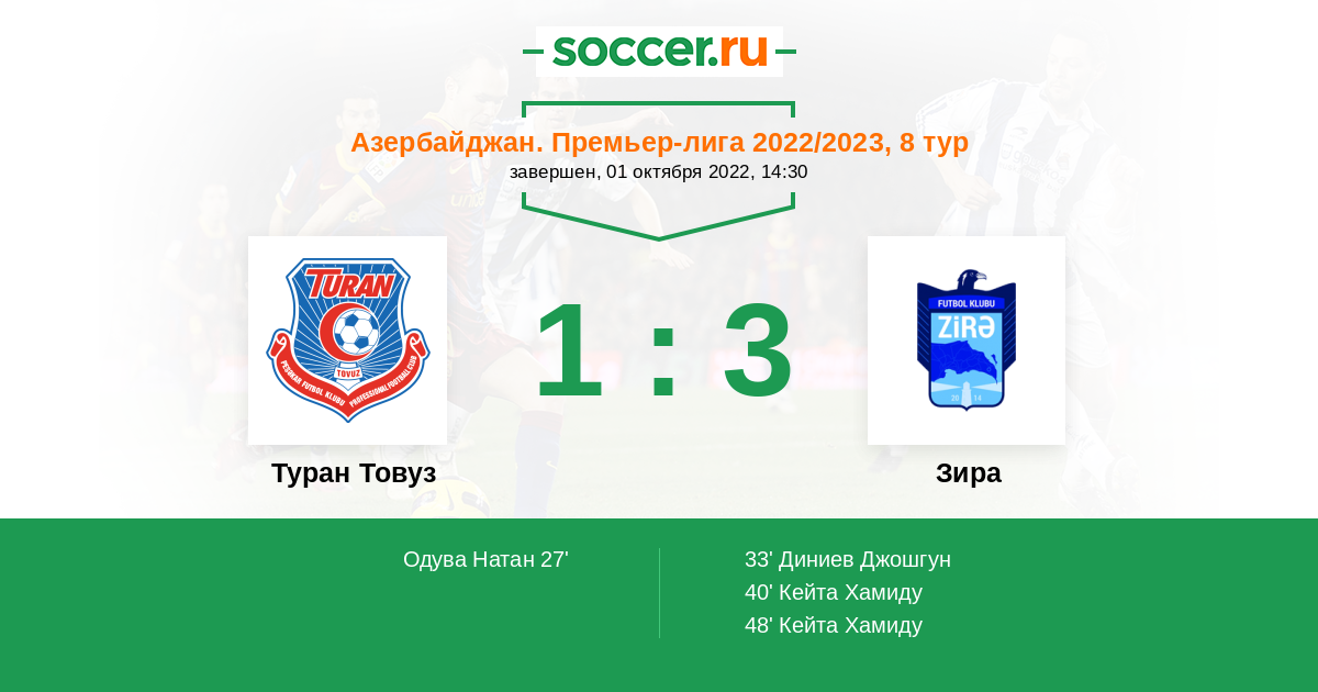 27' ГолЛоготип Туран ТовузОдува Натан (17) - 1:0