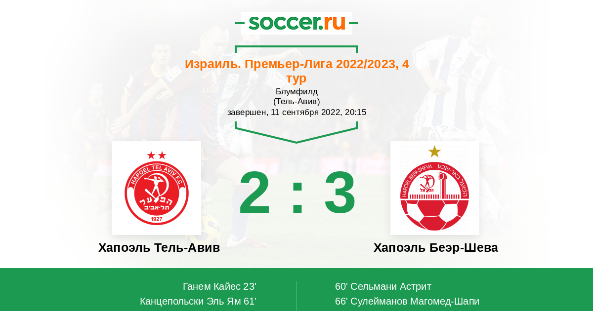 23' ГолЛоготип Хапоэль Тель-АвивГанем Кайес (12, п) - 1:0
