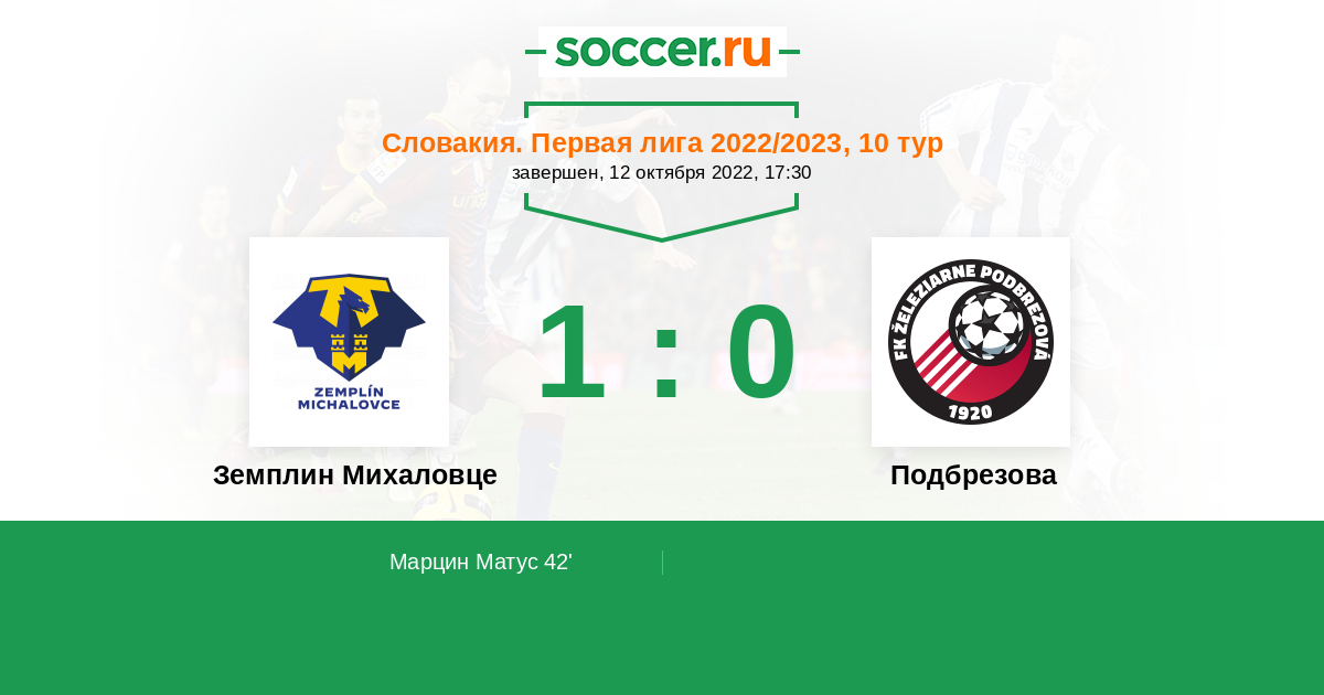 42' ГолЛоготип Земплин МихаловцеМарцин Матус (9, н) - 1:0