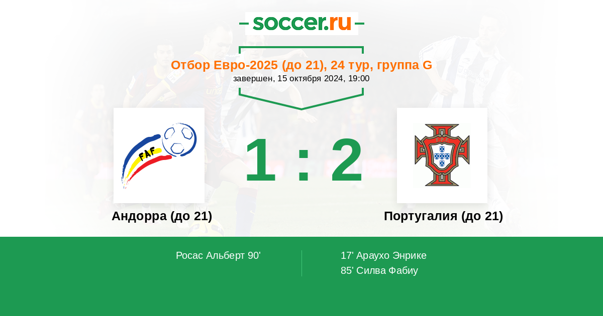 90' ГолАндорра (до 21)Росас Альберт (11) (A. Rodrigo Tapia) - 1:2