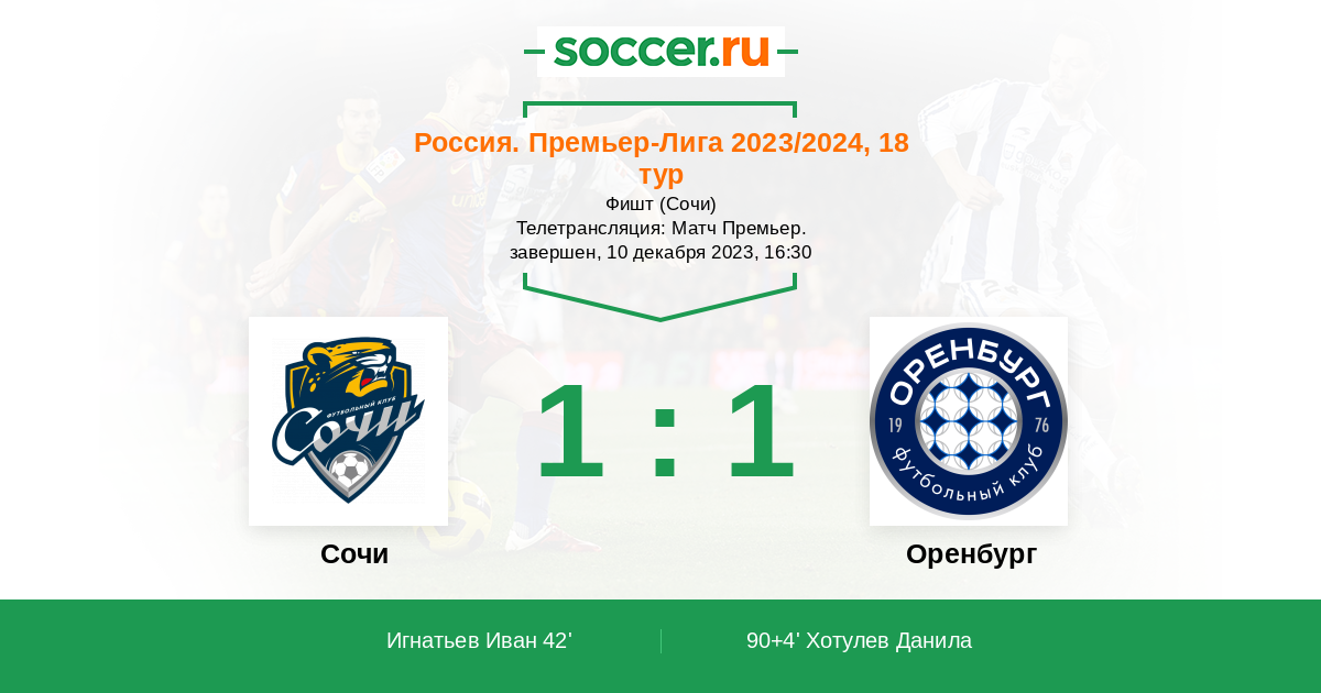 Сочи в последнее время сильно сдал, и каждый матч команде даётся всё труднее и труднее. И к слову говоря, коллектив не может победить в основное время на протяжении четырёх встреч кряду, и что особенно бросается в глаза, так это оборонительный механизм клуба. Ведь в каждой игре коллектив пропускал минимум два гола, а в общей сложности ему довелось допустить аж десять пропущенных мячей. Честно говоря, сомнений очень много в том, что клуб проведёт образцово-показательный матч против гостей из Оренбурга.