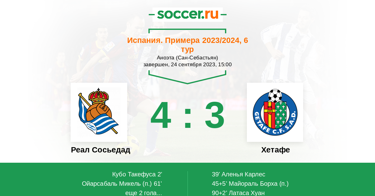 90+2' ГолЛоготип ХетафеЛатаса Хуан (14, н) (Логотип ХетафеРико Диего (16, з)) - 4:3