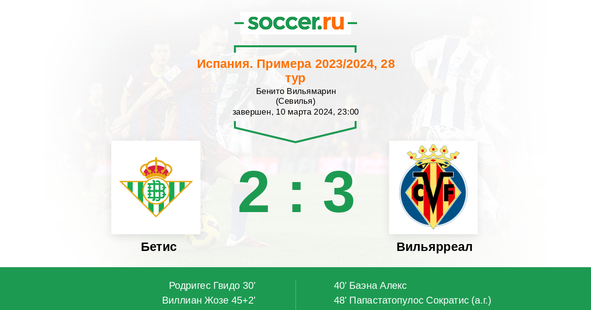45+2' ГолЛоготип БетисВиллиан Жозе (12, н) (Логотип БетисФорнальс Пабло (18, п)) - 2:1