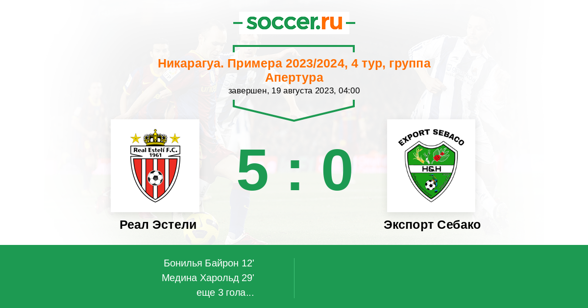 Реал Эстели - Экспорт Себако ! Обе команды отлично стартовали в нынешнем турнире , одержав по 3 победы . Предположу , что в этом матче будет упорная борьба в которой верх одержат хозяева поля .