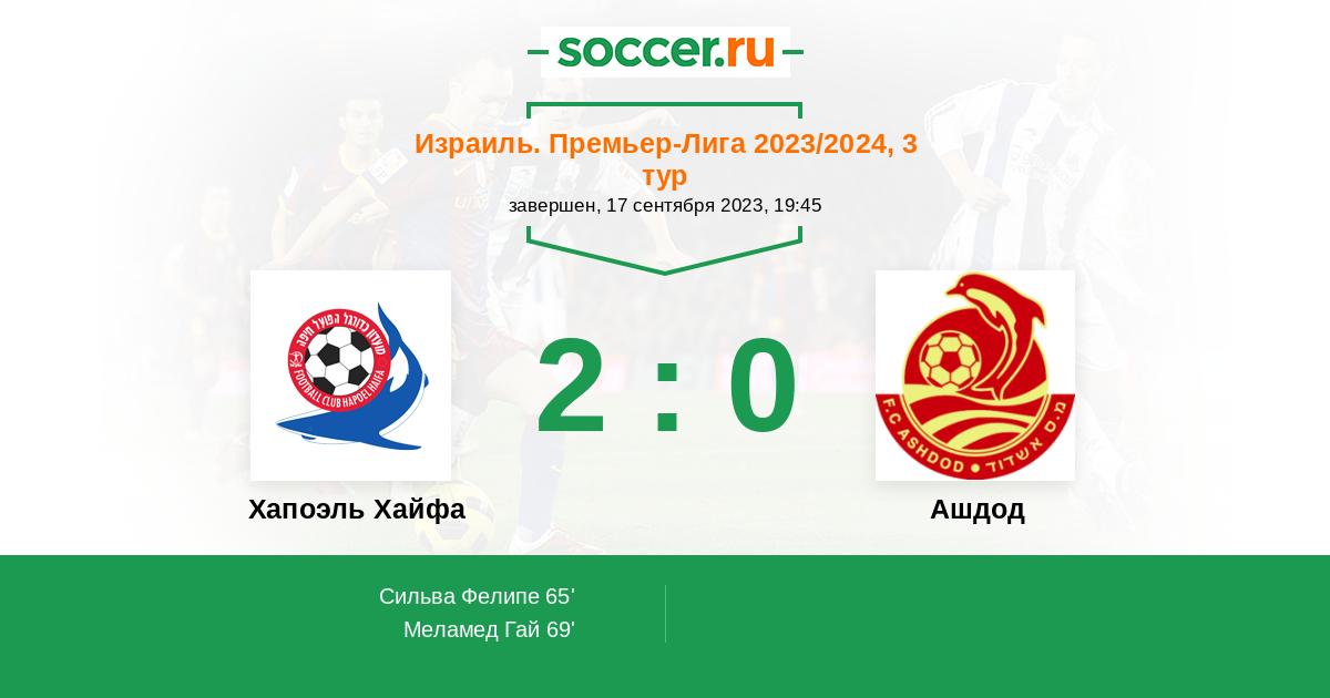 65' ГолЛоготип Хапоэль ХайфаСильва Фелипе (11, н) (Логотип Хапоэль ХайфаСабаг Наор (55, п)) - 1:0
