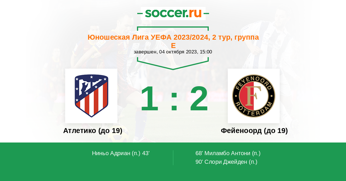 90' Гол с пенальтиЛоготип Фейеноорд (до 19)Слори Джейден (7) - 1:2 (П)