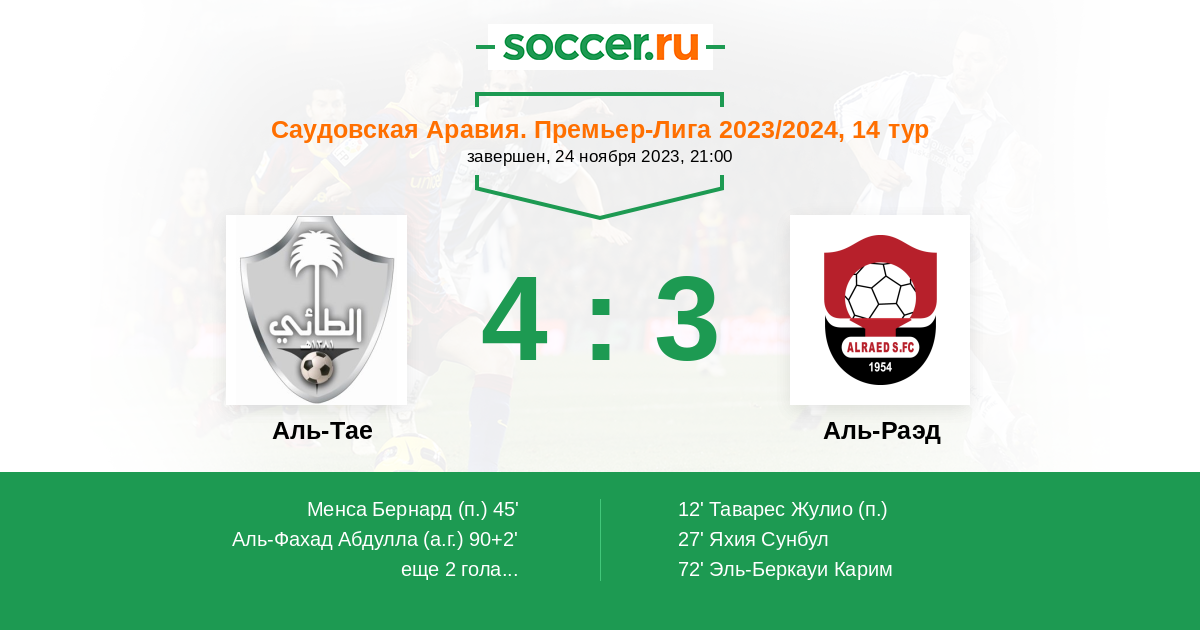12' Гол с пенальтиЛоготип Аль-РаэдТаварес Жулио (17, н) - 0:1 (П)
