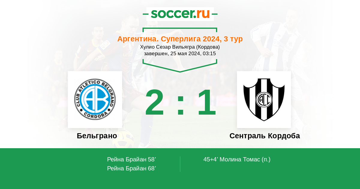 68' ГолЛоготип БельграноРейна Брайан (11, н) - 2:1