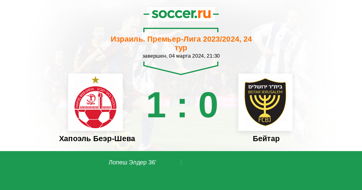 36' ГолЛоготип Хапоэль Беэр-ШеваЛопеш Элдер (22, з) (Логотип Хапоэль Беэр-ШеваГордана Роэй (8, п)) - 1:0