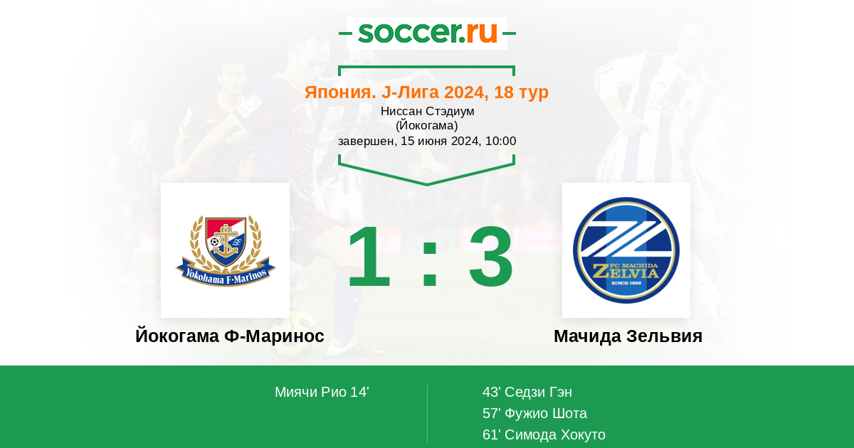 14' ГолЛоготип Йокогама Ф-МариносМиячи Рио (23, н) (Логотип Йокогама Ф-МариносВатанабе Кота (6, п)) - 1:0