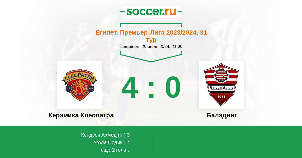 42' ГолЛоготип Керамика КлеопатраУгола Содик (8, п) (Логотип Керамика КлеопатраТони Мохамед (14, п)) - 3:0
