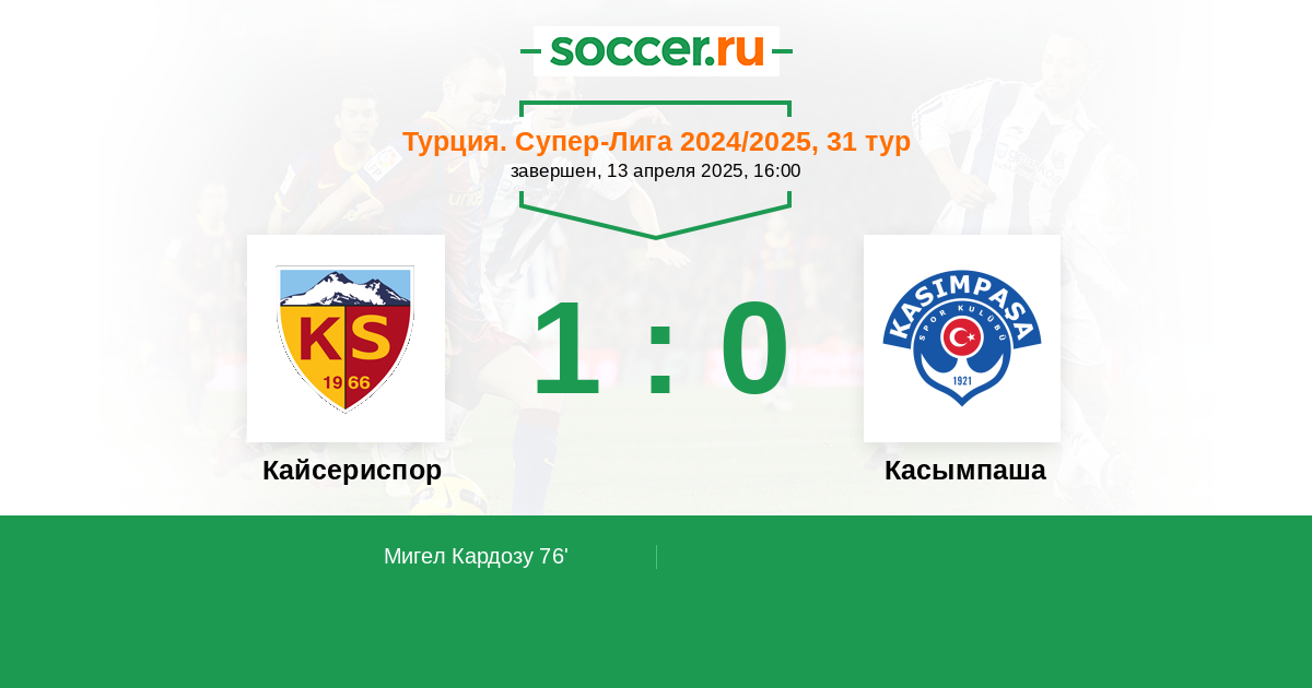 76' ГолЛоготип КайсериспорМигел Кардозу (7, п) (Логотип КайсериспорКарлос Манэ (20, п)) - 1:0