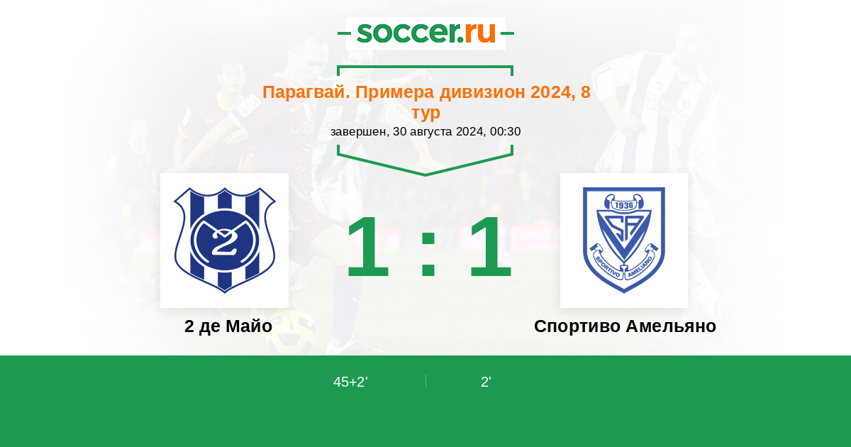 2' ГолЛоготип Спортиво АмельяноA. Servian (12) (Логотип Спортиво АмельяноСаркис Элиас (21)) - 0:1