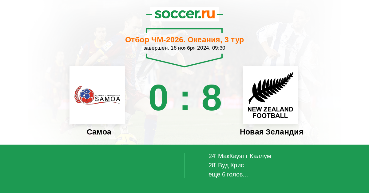 60' ГолНовая ЗеландияВуд Крис (9) (Новая ЗеландияУэйн Бен (18)) - 0:4