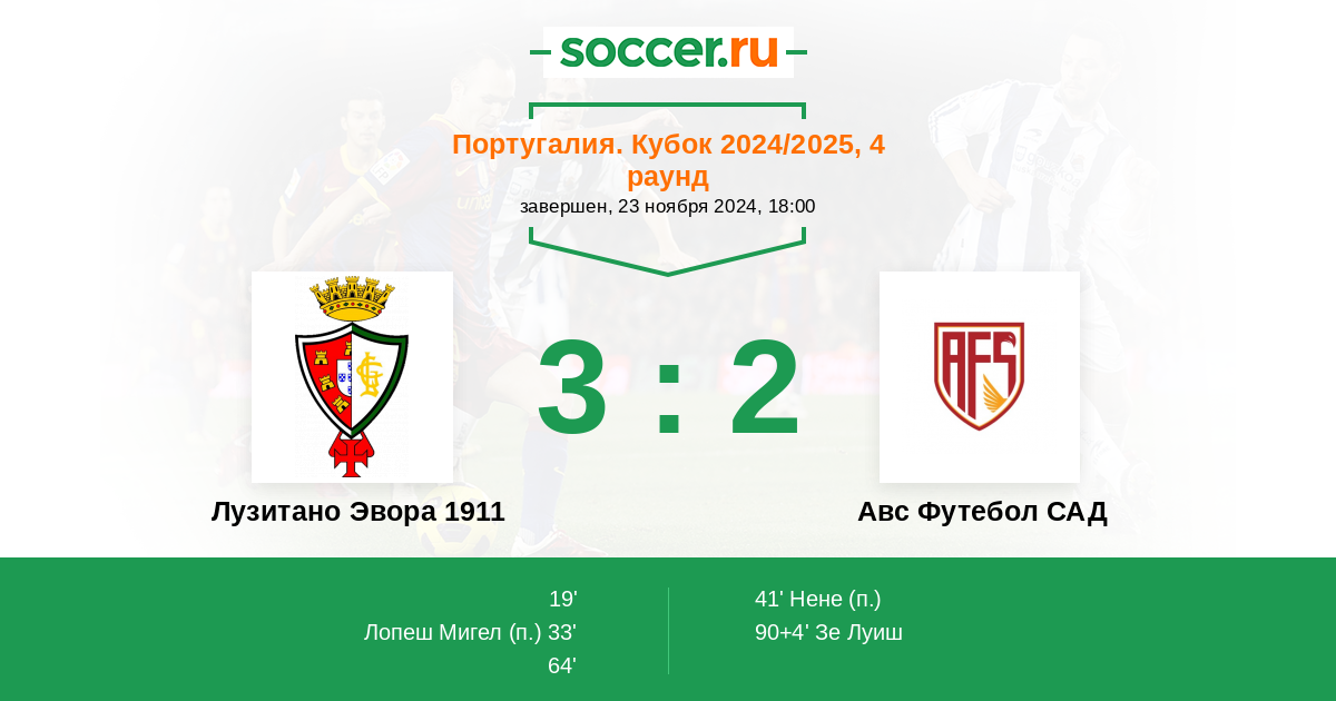 33' Гол с пенальтиЛоготип Лузитано Эвора 1911Лопеш Мигел (7) - 2:0 (П)