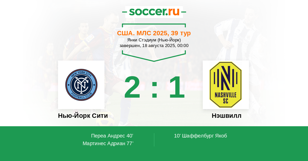 40' ГолЛоготип Нью-Йорк СитиПереа Андрес (8, п) (Логотип Нью-Йорк СитиВольф Ханнес (17, п)) - 1:1