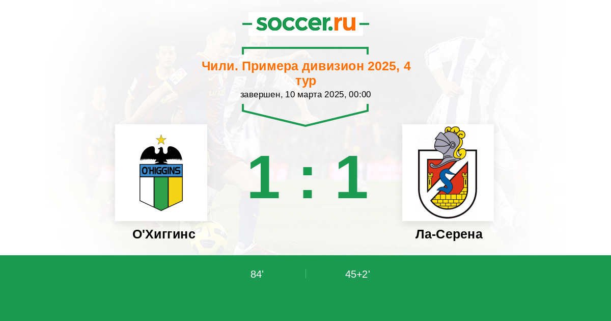 84' ГолЛоготип О'ХиггинсE. Calderon (19) (Логотип О'ХиггинсГодой Родриго (26, п)) - 1:1
