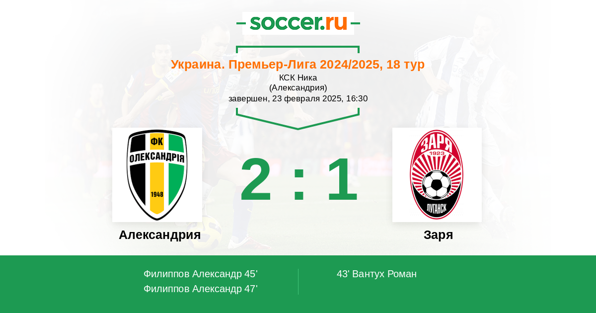43' ГолЛоготип ЗаряВантух Роман (47, з) (Логотип ЗаряПопара Деян (6, п)) - 0:1