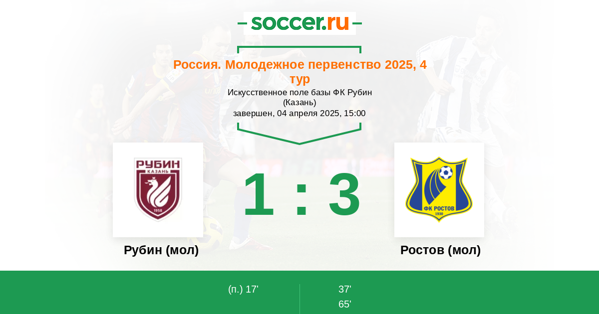 17' Гол с пенальтиЛоготип Рубин (мол)F. Zolotarev - 1:0 (П)