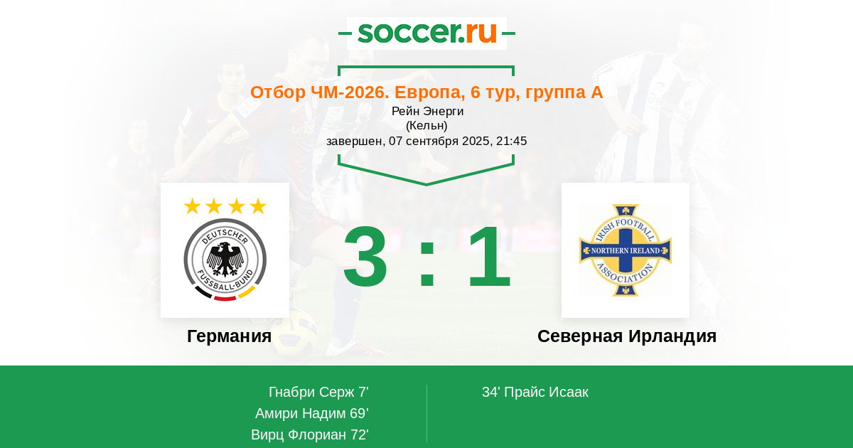 Германия - Северная Ирландия ! Вчера англичане меня " обули " , сегодня проверим на амбициозность немцев . Играют дома после сухого поражения . Оборона надо сказать у хозяев " прихрамывает ". Играют с лидером группы который им вполне " по зубам " . Стул под Нагелем " заскрипел ". Доводов можно ещё приводить много - но остальное покажет игра . ТБ .