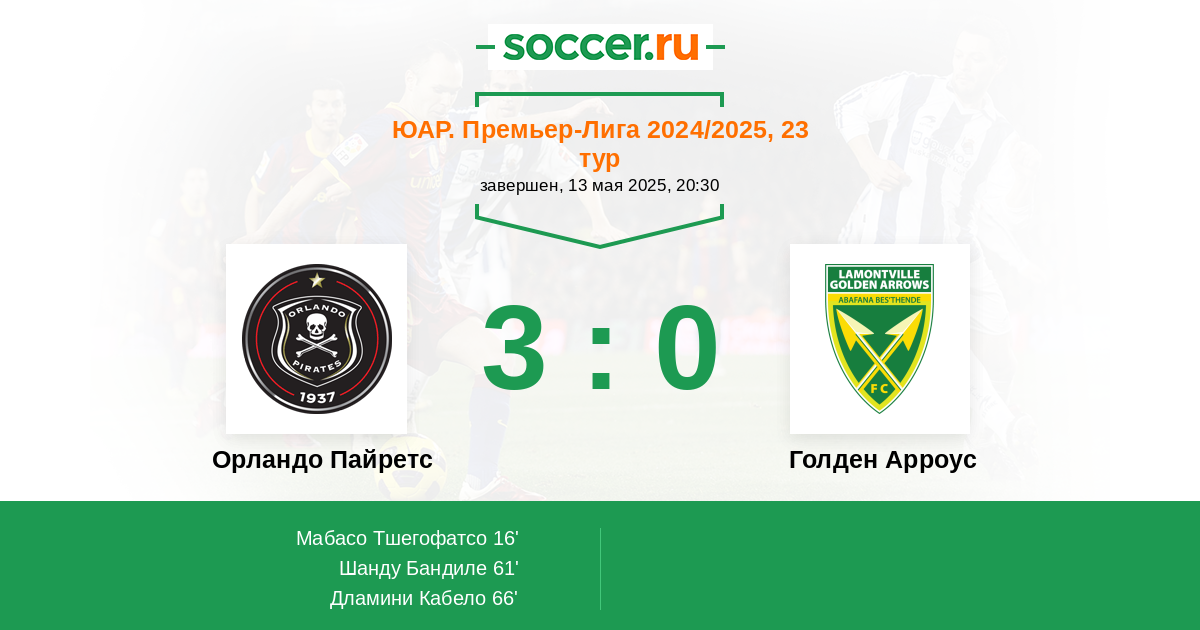 66' ГолЛоготип Орландо ПайретсДламини Кабело (18, п) - 3:0