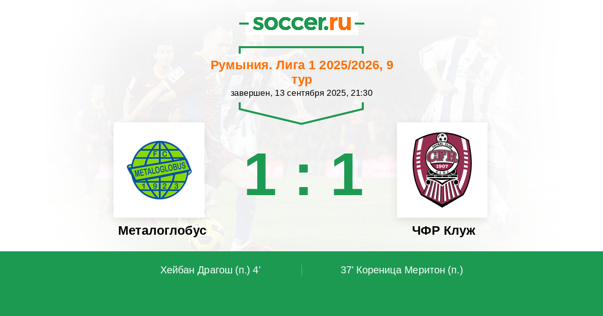 37' Гол с пенальтиЛоготип ЧФР КлужКореница Меритон (17, н) - 1:1 (П)