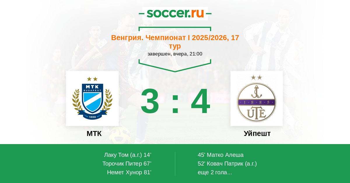68' ЗаменаЛоготип УйпештТойти Матьяш (10, п) уходит с поля