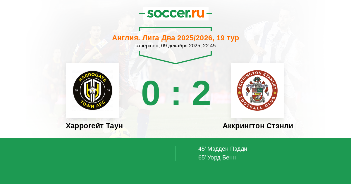 45' ГолЛоготип Аккрингтон СтэнлиМэдден Пэдди (8, н) (Логотип Аккрингтон СтэнлиЛав Дональд (2, п)) - 0:1