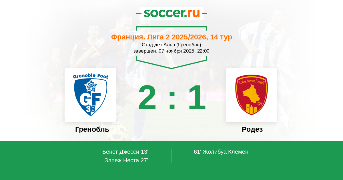 13' ГолЛоготип ГренобльБенет Джесси (8, п) (Логотип ГренобльЭлпеж Неста (23, н)) - 1:0