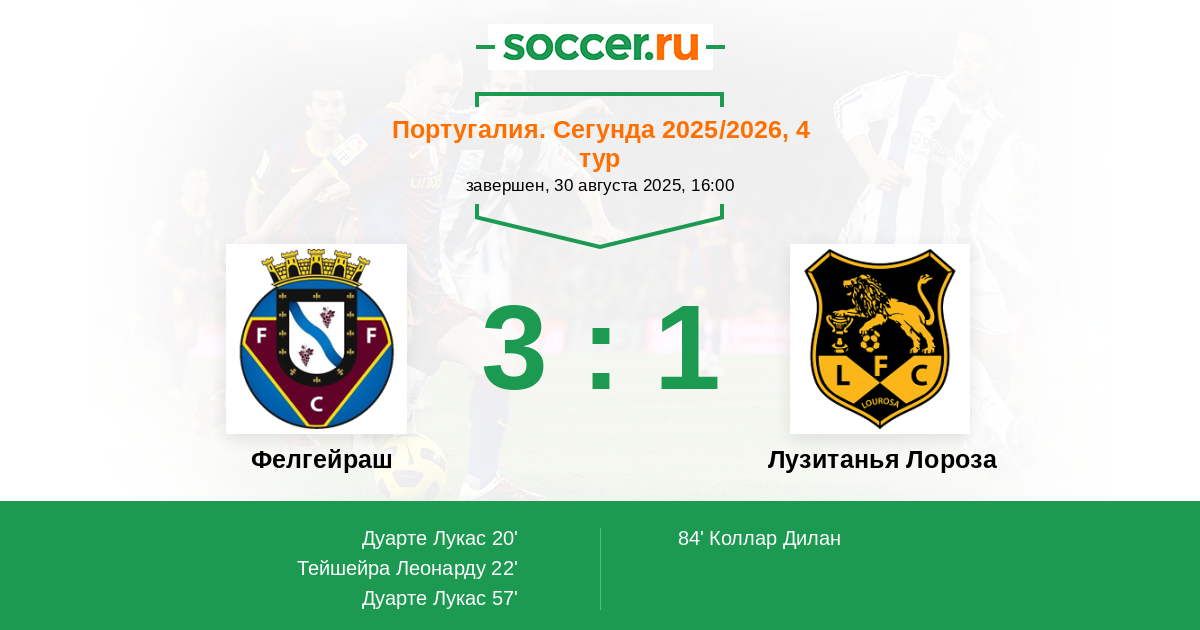 20' ГолЛоготип ФелгейрашДуарте Лукас (19, н) (Логотип ФелгейрашМорейра Васко (78, п)) - 1:0