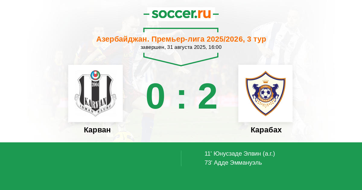 11' АвтоголЛоготип КарванЮнусзаде Элвин (32) - 0:1 (А)