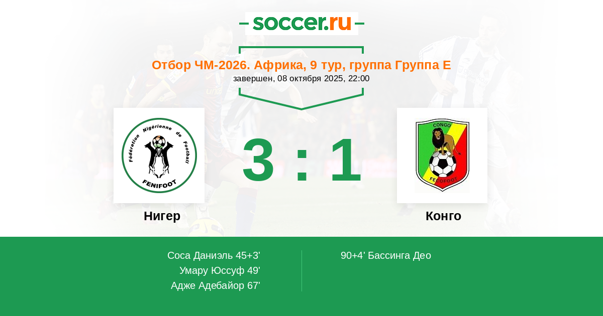 67' ГолНигерАдже Адебайор (10, п) (НигерУмару Юссуф (6, п)) - 3:0