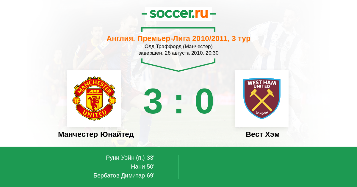 50' ГолЛоготип Манчестер ЮнайтедНани (17, п) (Логотип Манчестер ЮнайтедРуни Уэйн (10, н)) - 2:0