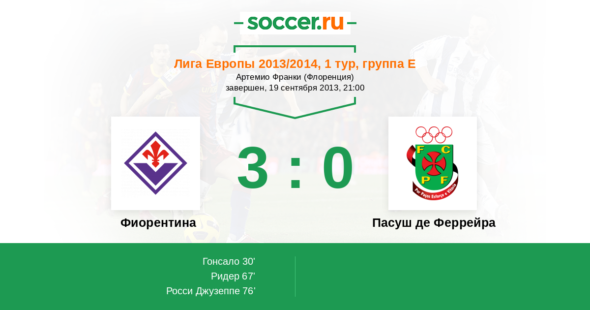 67' ГолЛоготип ФиорентинаРидер (30) (Логотип ФиорентинаВалеро Борха (20)) - 2:0