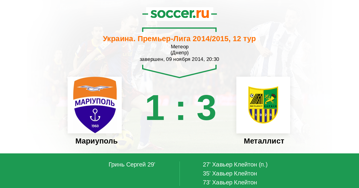 27' Гол с пенальтиЛоготип Металлист Хавьер Клейтон (10) - 0:1 (П)