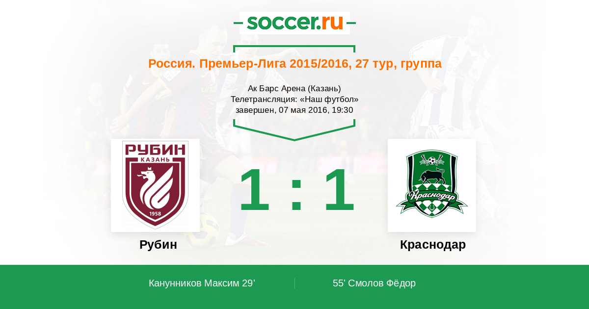 55' ГолЛоготип КраснодарСмолов Фёдор (90, н) (Логотип КраснодарКалешин Виталий (17, з)) - 1:1