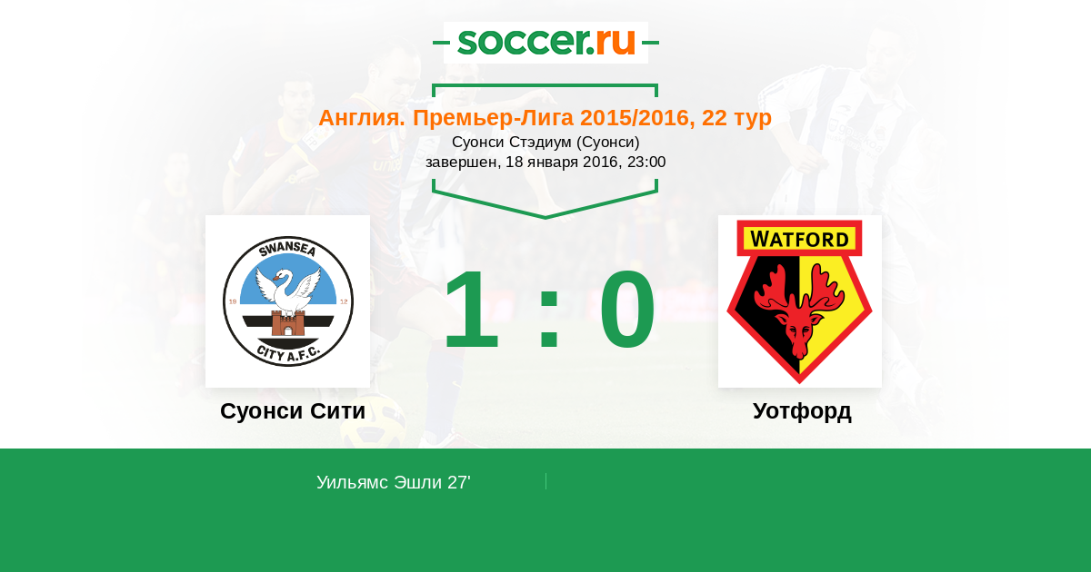 27' ГолЛоготип Суонси СитиУильямс Эшли (6, з) (Логотип Суонси СитиКи Сон-Ен (4, п)) - 1:0