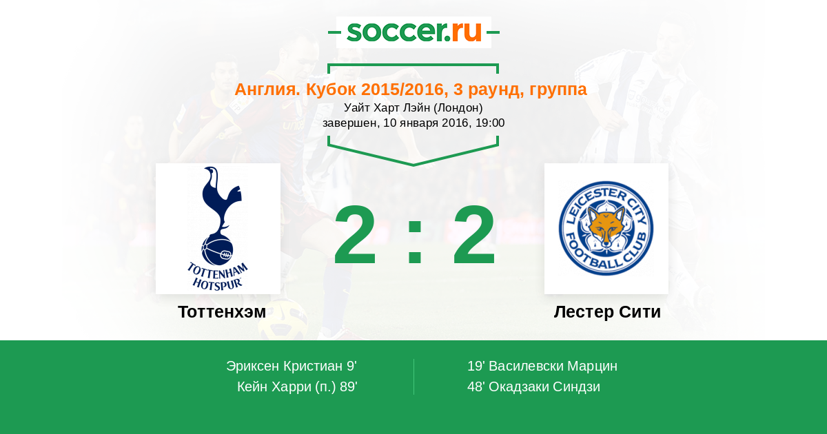 Закончился поединок на "Уайт Харт Лэйн" ничейным счётом 2:2! А это означает, что будет переигровка поединка. Очень жарко было в конце поединка, много моментов и борьбы! "Тоттенхем" много владел мячом, комбинировал, играл с позиции силы, а "Лестер" держал оборону и выбегал в контратаки. Приглашаем проставить оценки участникам сегодняшнего матча http://www.soccer.ru/matches/ratings/1000185.shtml. Матч для Вас комментировал Старчеус Сергей, любите футбол, оставайтесь вместе с http://www.soccer.ru!
