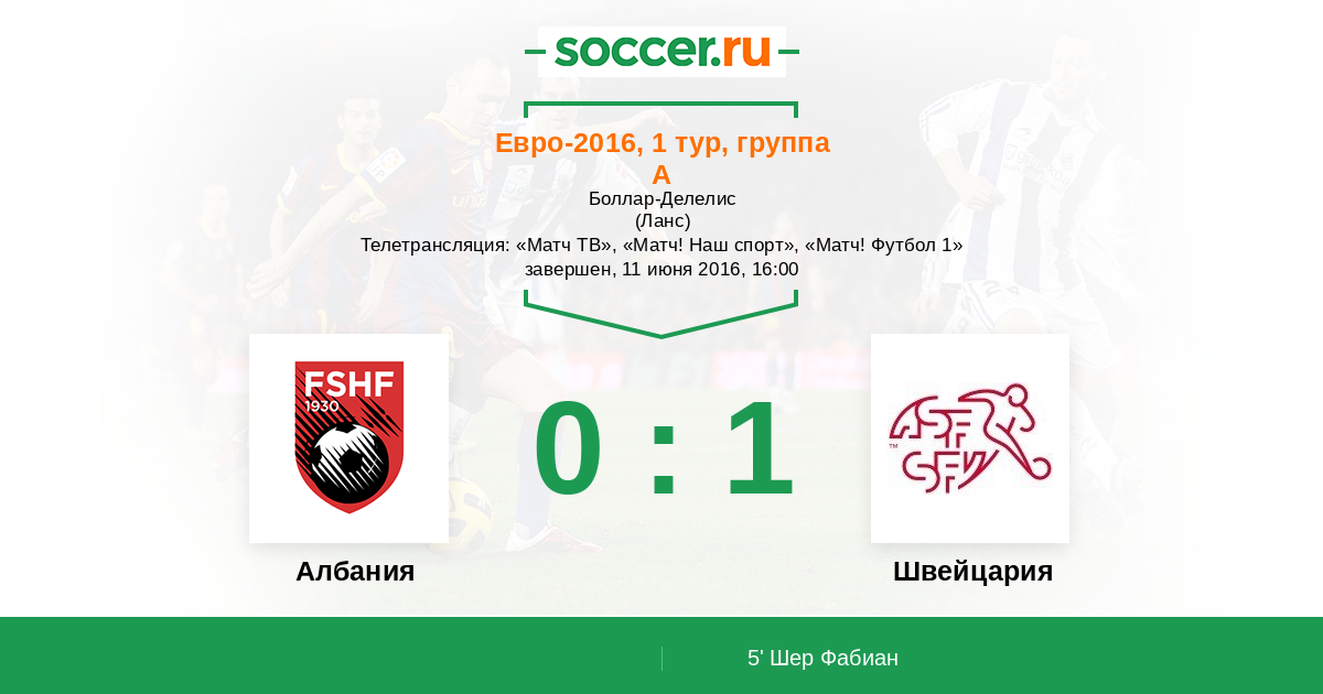 Сборная Швейцарии благодаря победе набирает три очка и улучшает свои шансы на выход из группы. Кстати, эта победа - первая в истории выступлений сборной Швейцарии на чемпионатах Европы именно в первом матче. Сборная Албании очень понравилась, уж точно в роли туристов эта команда не будет. Предлагаем Вам выбрать лучших игроков поединка в составах команд: http://www.soccer.ru/matches/ratings/1000917.shtml. Для Вас эту трансляцию провел Андрей Бабенчук. Оставайтесь на http://www.soccer.ru, у нас для Вас еще много интересного!