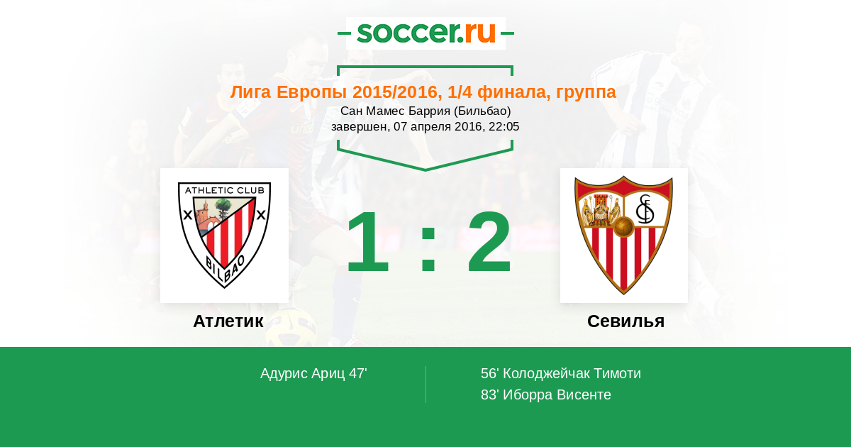 Матч между "Атлетиком" Бильбао и "Севильей" выдался нервным и напряжённым, после игры вопросов стало больше, чем ответов. В первом противосстоянии победителем вышли в матче футболисты "Севильи", но всё решится в ответной встрече. Хозяева старались много контролировать мяч и играть в комбинационный футбол, гости играли на контратаках. Приглашаем проставить оценки игрокам матча http://www.soccer.ru/matches/ratings/1007563.shtml. Прямую текстовую онлайн трансляцию матча провёл Старчеус Сергей. До новых встреч на http://www.soccer.ru !