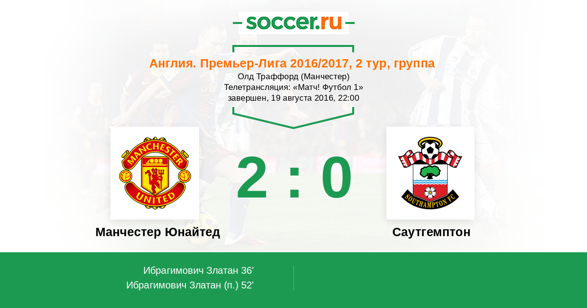 Все! Звучит финальный свисток! "Манчестер Юнайтед" на "Олд Траффорд" благодаря дублю Златана Ибрагимовича обыгрывает "Саутгемптон" со счетом 2:0 и упрочняет лидерство в турнирной таблице английской Премьер-лиги! Предлагаем Вам выбрать лучших игроков в составах обеих команд: http://www.soccer0001.com/matches/ratings/1010718.shtml. Для Вас прямую трансляцию матча провел Андрей Бабенчук. До новых встреч на http://www.soccer.ru/ !